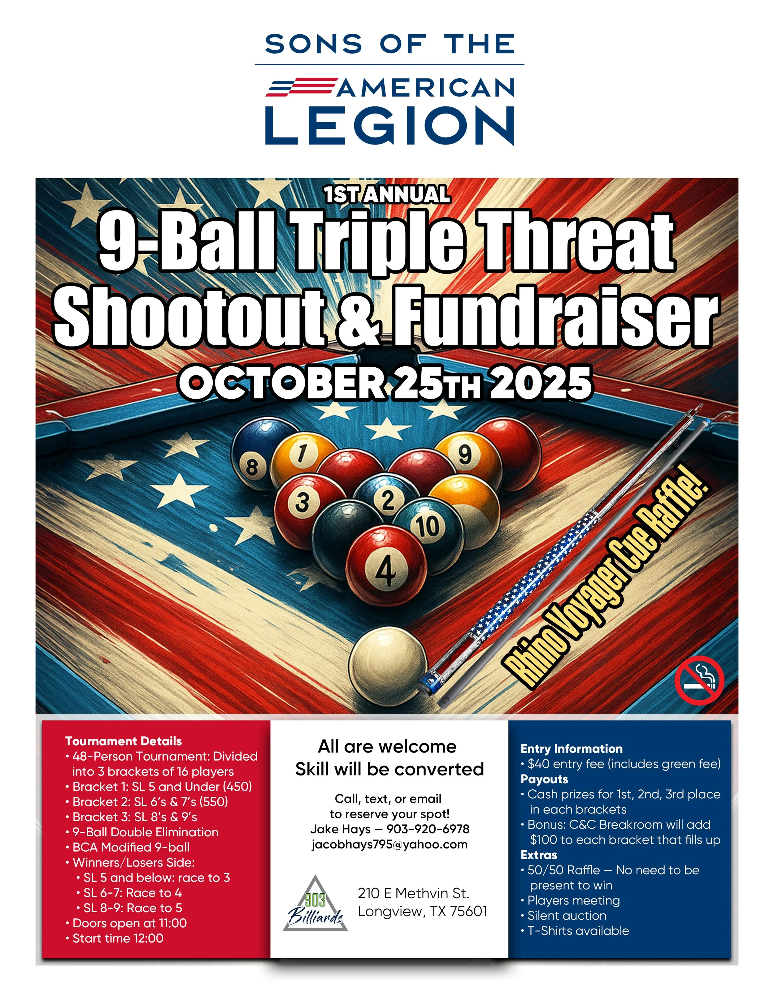 9-BALL TRIPLE THREAT SHOOTOUT & FUNDRAISER Oct 25 at 11:00 a.m.